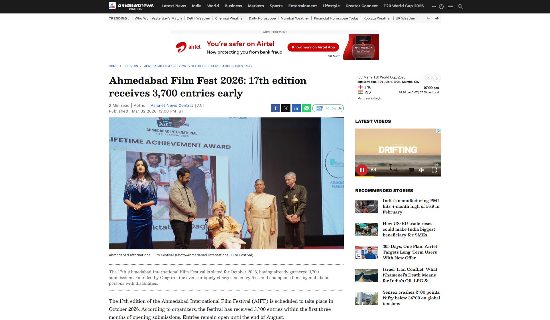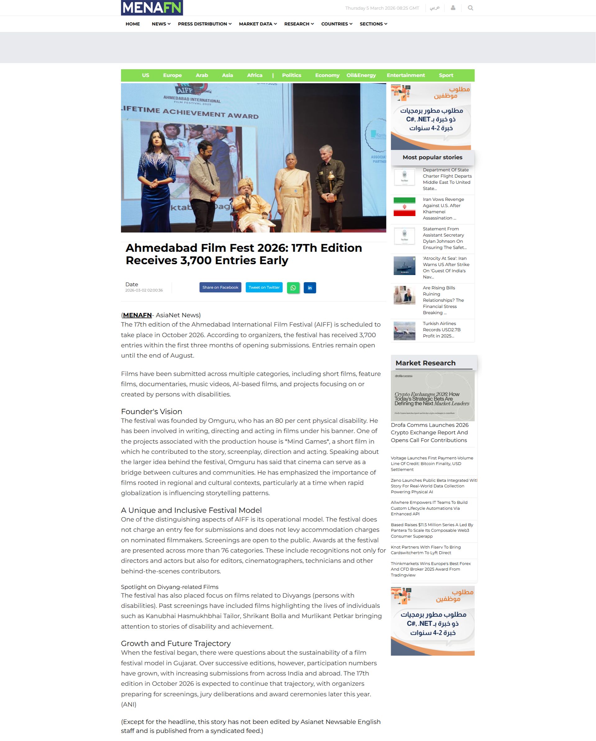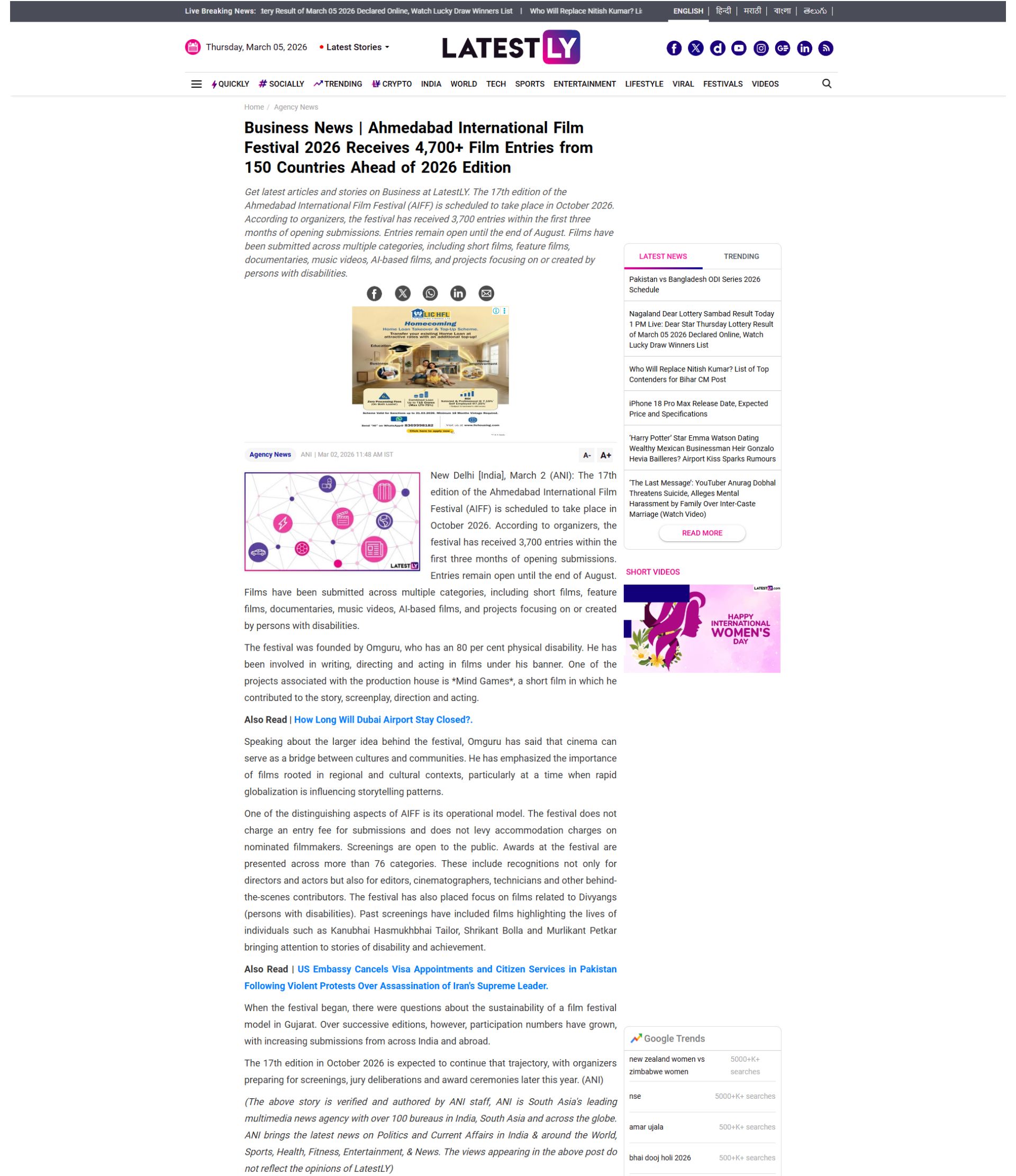 Business News | Ahmedabad International Film Festival 2026 Receives 4,700+ Film Entries from 150 Countries Ahead of 2026 Edition